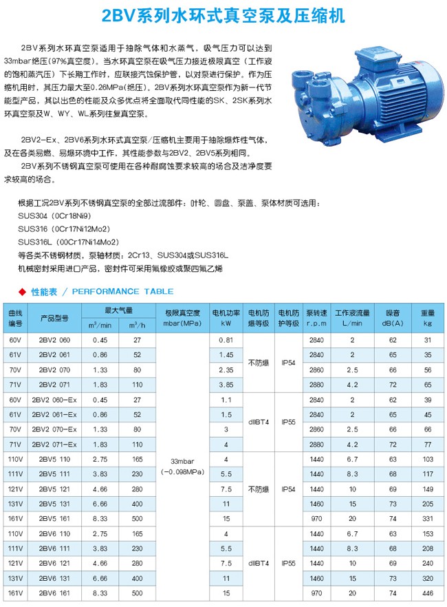 2BV水環(huán)真空泵适用于抽(chou)除氣體和水蒸氣(qì),吸氣壓力可以達(dá)到㊙️33mbar絕💋壓(97%真空度)。當(dang)真空泵在吸氣壓(ya)力低于80mbar的狀🏃态下(xià)長期工作時,應聯(lián)接氣蝕保護管,以(yǐ)對泵進行保護。如(ru)配大氣噴射器,吸(xi)🛀氣壓力可達10mbar,噴射(she)器可直接安裝在(zai)真空泵上。作為壓(yā)縮機用時,其壓力(li)至0.26MPa(絕壓) 。